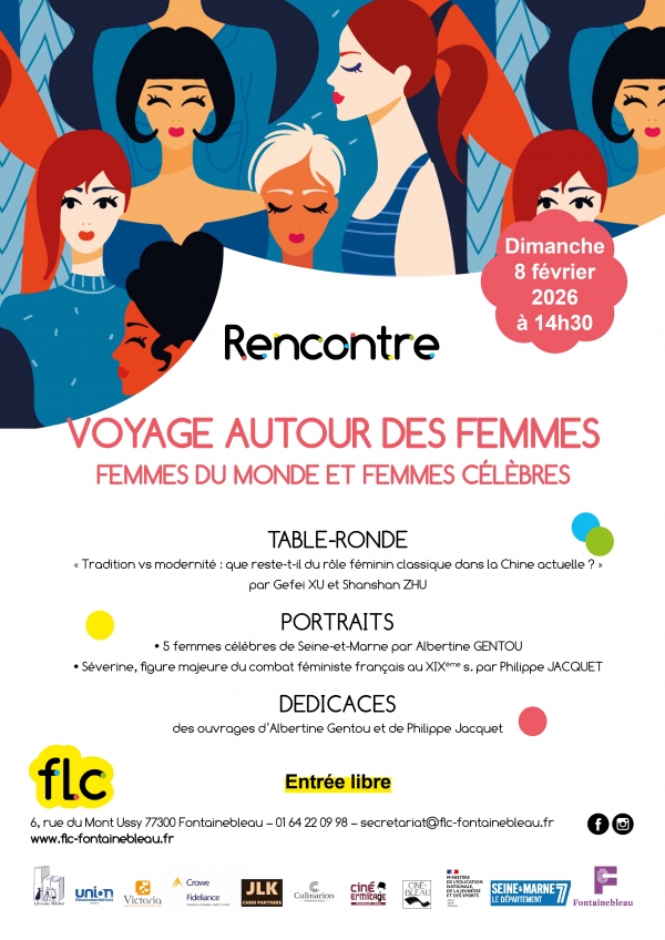 FLC vous invite pour un après-midi d'échanges à la rencontre d'une diversité de femmes : TABLE-RONDE « Tradition vs modernité : que reste-t-il du rôle féminin classique dans la Chine actuelle ? » par Gefei XU et Shanshan ZHU ; PORTRAITS de 5 femmes célèbres de Seine-et-Marne par Albertine GENTOU ; PORTRAIT de Séverine, de son vrai nom Caroline Rémy (1855-1929), figure majeure du combat féministe français au XIXème siècle, par Philippe JACQUET. L'après-midi se clôturera autour des dédicaces des ouvrages d'Albertine Gentou et de Philippe Jacquet. // Les intervenants : Gefei XU dirige la filiale française du China National Publications Import and Export Group. Son récit autobiographique, Petite Fleur de la Mandchourie, est publié aux Éditions XO. Conférencière, elle partage les histoires et la sagesse ancestrales chinoises à travers des interventions en France et à l'international. Shanshan ZHU est rédactrice web pour Chine-info depuis 2012, elle y met pleinement à profit son parcours et ses expériences interculturelles. Albertine GENTOU a été journaliste et chroniqueuse dans la presse. Installée désormais dans le sud Seine-et-Marnais, elle est biographe et romancière, et s'adonne au plaisir de dresser des portraits, de mettre en lumière des destins hors du commun. Philippe JACQUET jusqu'alors professeur d'histoire au Lycée François 1er de Fontainebleau, est depuis peu à la retraite. Il anime des séances de discussion et de débat sur des thèmes historiques mais aussi un atelier d'écriture. Il a publié deux romans policiers et un troisième est en cours de rédaction.