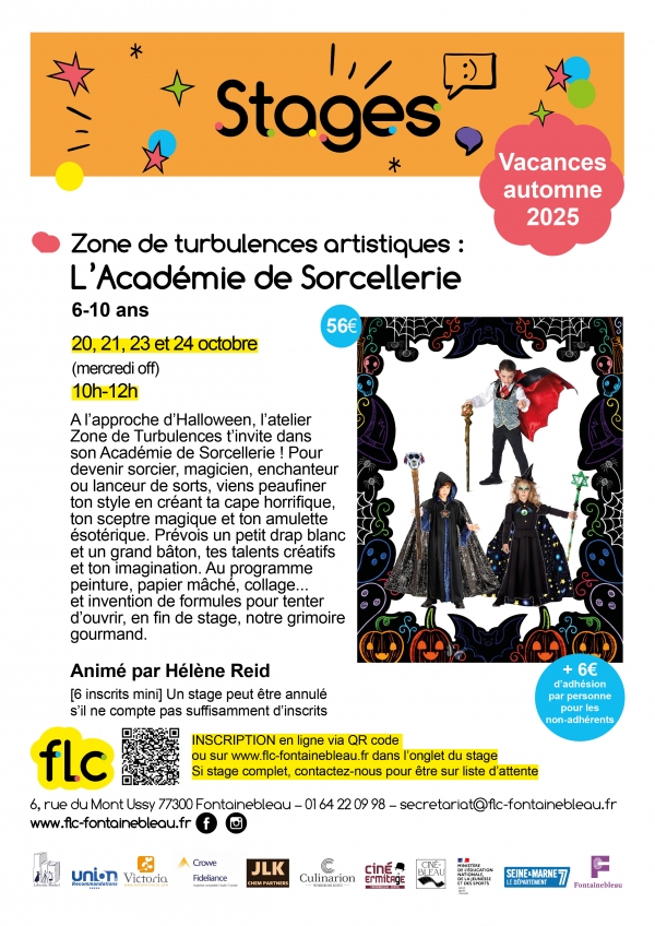 Du 20 au 24 octobre sauf mercredi 22 . A l'approche d'Halloween, l'atelier Zone de Turbulences t'invite dans son Académie de Sorcellerie ! Pour devenir sorcier, magicien, enchanteur ou lanceur de sorts, viens peaufiner ton style en créant ta cape horrifique, ton sceptre magique et ton amulette ésotérique. Prévois un petit drap blanc et un grand bâton, tes talents créatifs et ton imagination. Au programme peinture, papier mâché, collage... et invention de formules pour tenter d'ouvrir, en fin de stage, notre grimoire gourmand. >Inscription en ligne via ce LIEN. [Si stage complet, contactez-nous pour être sur liste d'attente]