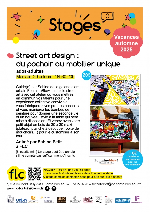 Guidé(e) par Sabine de la galerie d'art urbain FontaineBlow, testez le street art avec cet atelier où vous mettrez en commun vos talents pour une expérience collective conviviale : vous fabriquerez vos propres pochoirs et vous manierez les bombes de peinture pour donner une seconde vie et un nouveau style à la table qui sera mise à disposition. Et venez avec votre petit objet en bois de 30 x 30 maxi (plateau, planche à découper, boite de mouchoirs...) pour le customiser à son tour ! >Inscription en ligne via ce LIEN. [Si stage complet, contactez-nous pour être sur liste d'attente]
