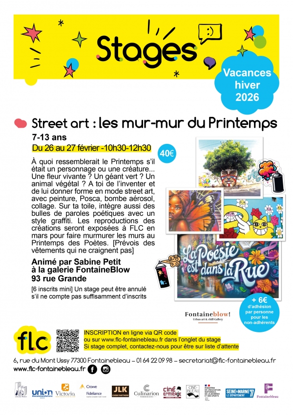 À quoi ressemblerait le Printemps s'il était un personnage ou une créature.... Une fleur vivante ? Un géant vert ? Un animal végétal ? A toi de l'inventer et de lui donner forme en mode street art, avec peinture, Posca, bombe aérosol, collage. Sur ta toile, intègre aussi des bulles de paroles poétiques avec un style graffiti. Les reproductions des créations seront exposées à FLC en mars pour faire murmurer les murs au Printemps des Poètes. [Prévois des vêtements qui ne craignent pas] >Inscription en ligne via ce LIEN. [Si stage complet, contactez-nous pour être sur liste d'attente]