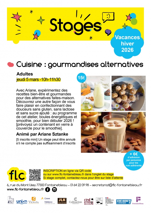 Avec Ariane, expérimentez des recettes bien-être et gourmandes pour des alternatives faites-maison. Découvrez une autre façon de vous faire plaisir en confectionnant des douceurs sans gluten, sans lactose et sans sucre ajouté : au programme de cet atelier, boules énergétiques et smoothie, pour bien débuter 2026 ! [prévoyez un contenant en verre à couvercle pour le smoothie] > Inscription en ligne via ce LIEN. [Si stage complet, contactez-nous pour être sur liste d'attente]