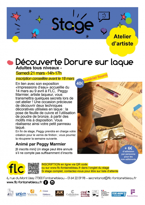En lien avec son exposition «Impressions d'eau» accueillie du 14 mars au 9 avril à FLC, Peggy Marmier, artiste laqueur, vous transmettra quelques secrets lors de cet atelier ! Une occasion précieuse de découvrir deux techniques décoratives utilisées en laque : la pose de feuille de cuivre et l'utilisation de poudre de bronze, à partir des motifs mis à disposition. Vous réaliserez ainsi votre petit panneau laqué. Le matériel est fourni. / En fin de stage, Peggy prendra en charge votre création pour le vernis de finition ; vous pourrez la récupérer la semaine suivante. / >Inscription en ligne via ce LIEN. [Si stage complet, contactez-nous pour être sur liste d'attente]